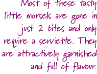 At Karen Will Cater we have an extensive range of homemade hot and cold, sweet and savoury finger food. Most of these tasty little morsels are gone in just 2 bites and only require a serviette. They are attractively garnished and full of flavour. All dipping sauces and accompaniments are included in the price. We also specialize in catering for people with special dietary needs. Foods marked (GF) are Gluten Free and (V) are Vegetarian. If you have other special dietary requirements please just let us know and we will make food appropriate for you.