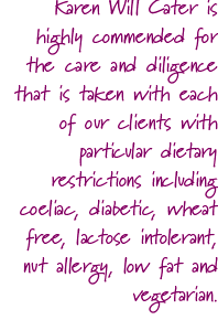 Karen Will Cater is highly commended for the care and diligence that is taken with each of our clients with particular dietary restrictions including coeliac, diabetic, wheat free, lactose intolerant, nut allergy, low fat and vegetarian. We are careful to discuss any concerns with our clients and can provide product lists if required. All of our menu items are home-made to the highest standard and we can guarantee the ingredients are monitored closely. Karen Will Cater has provided special diets for weddings, engagements, parties, corporate events, funerals, breakfasts, brunches, lunches, dinners and suppers. The good news is that our special diet menu is extensive and as affordable as the rest of our product range. You might like to browse through our savoury and sweet finger food menus. If you require catering for complete meals, please contact us so that we can discuss your specific needs.